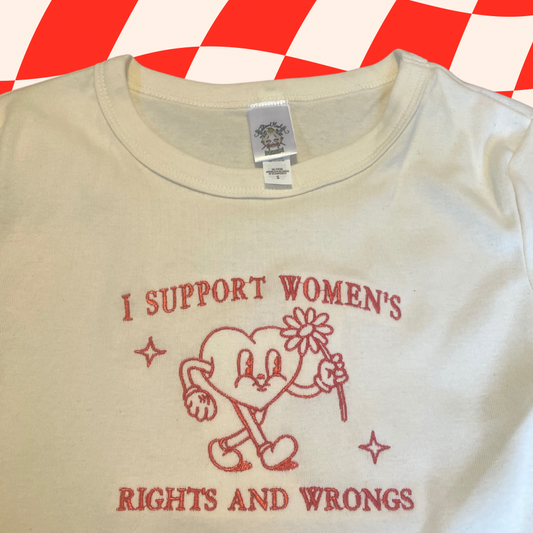 I Support Women's Rights And Wrongs Embroidered Baby Tee or Unisex T-Shirt Retro Heart Cartoon