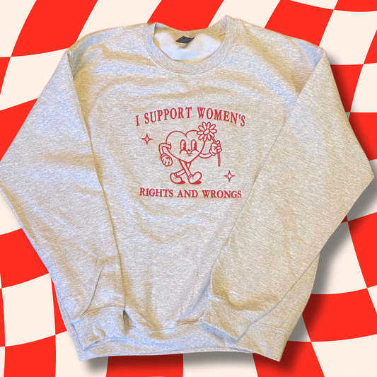 I Support Women's Rights And Wrongs Embroidered Unisex Crewneck Sweatshirt Retro Heart Cartoon