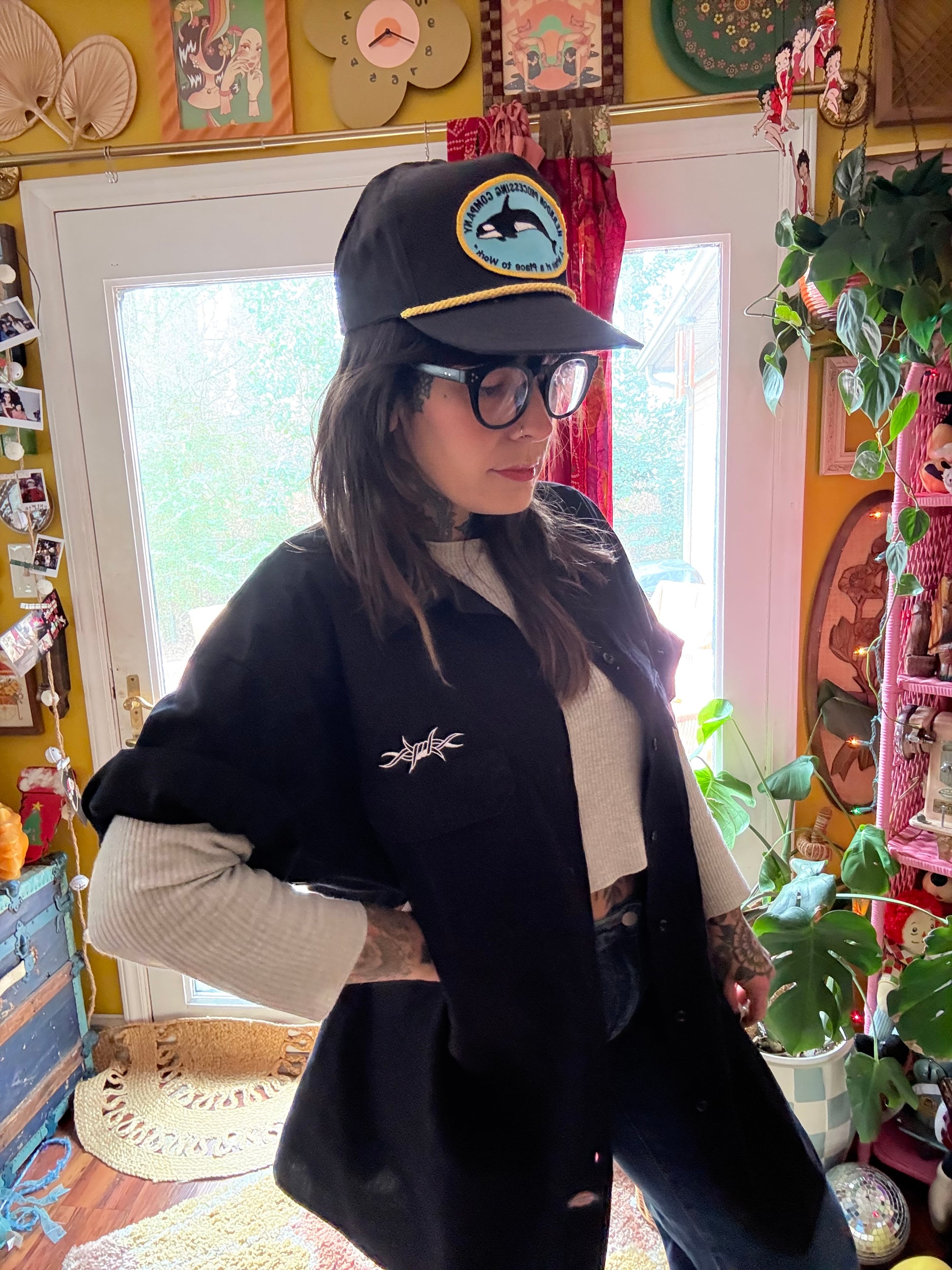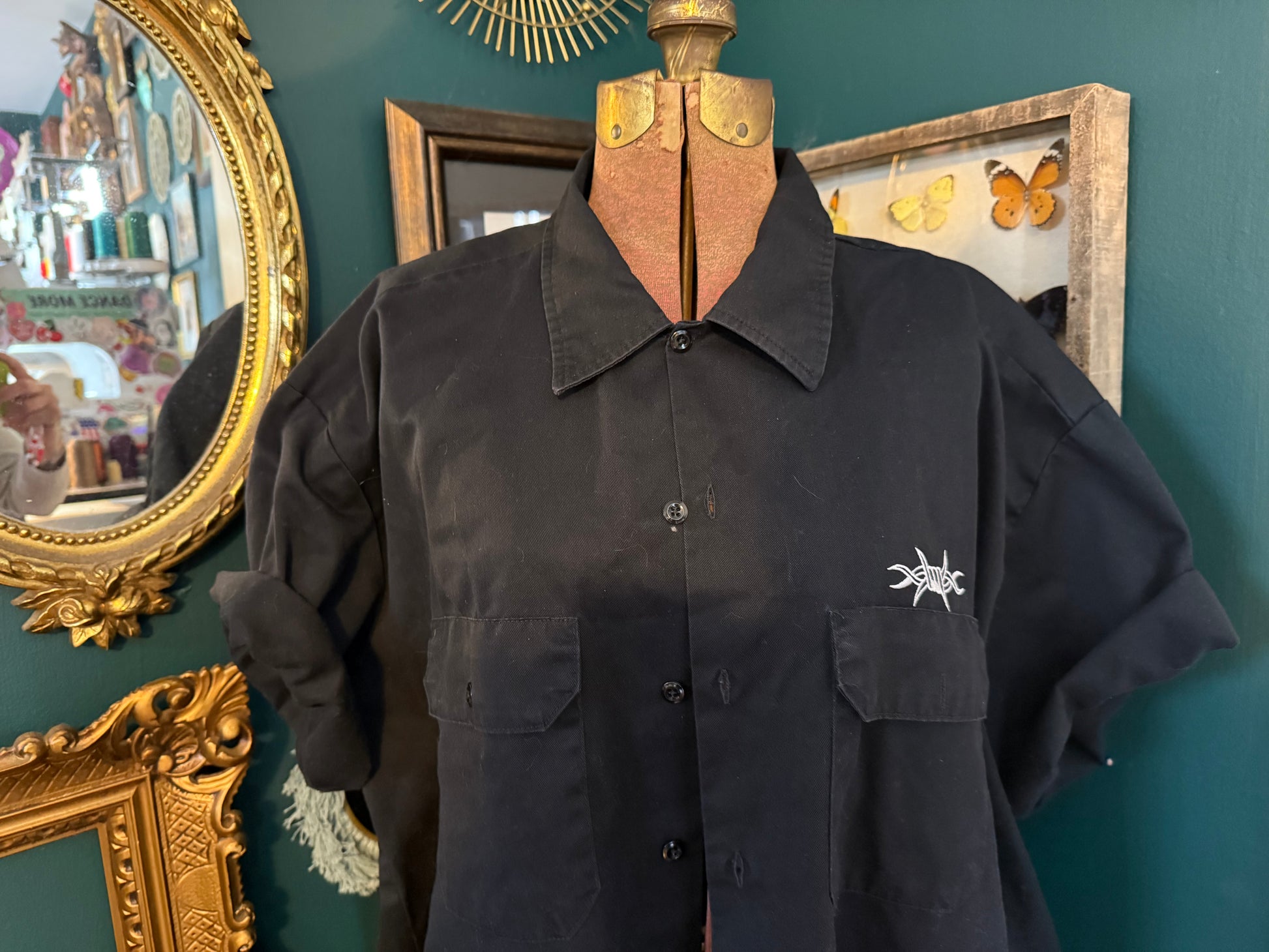 This isn’t your average work shirt—it’s a statement piece. Built on the rugged reliability of a Dickies black button up, this men’s size 2XL shirt has been transformed with bold, custom embroidery inspired by traditional tattoo flash art.