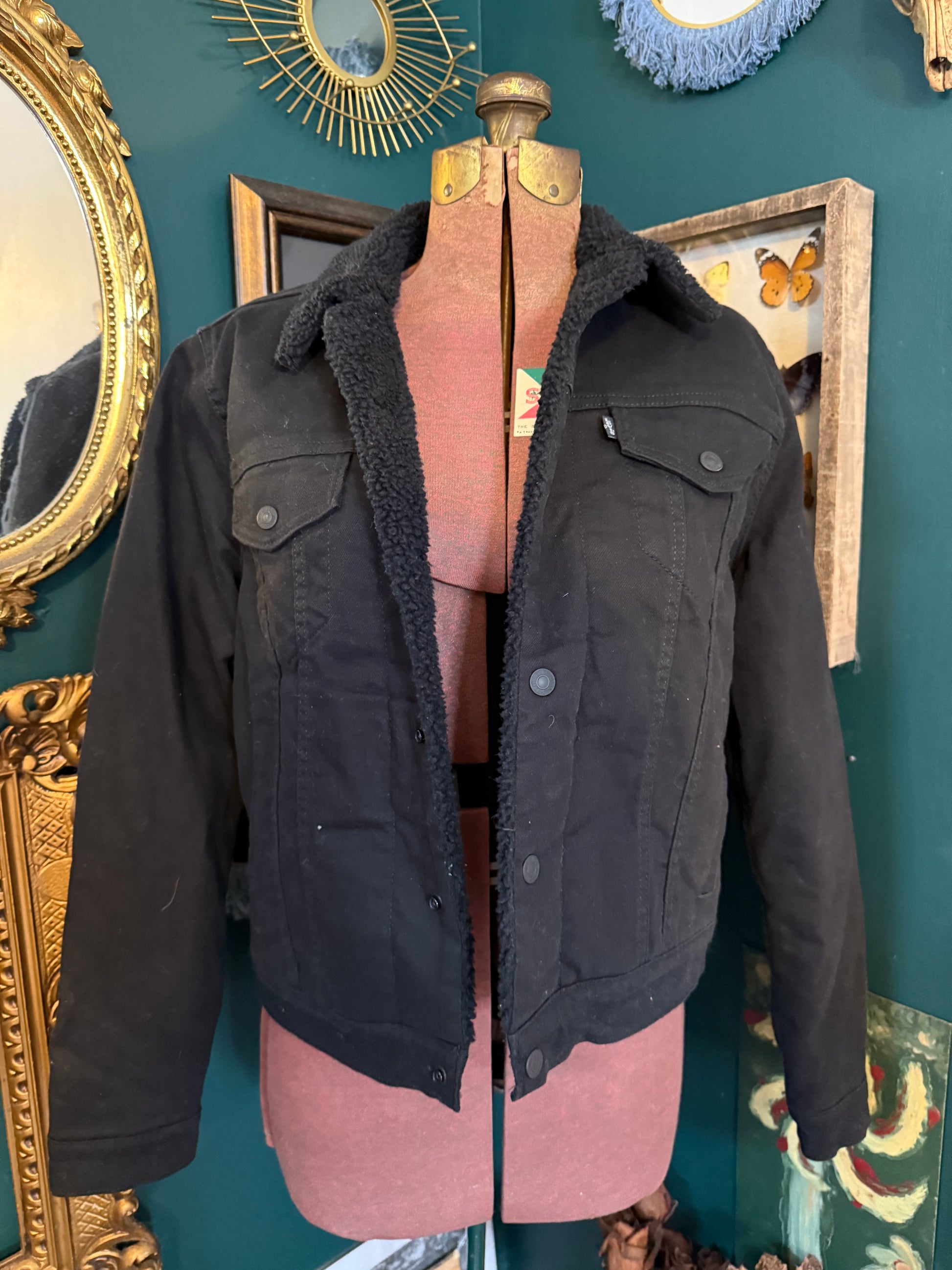 😇🔥 Repurposed & Embroidered Levi’s Sherpa Lined Black Denim Trucker Jacket – Women’s Large