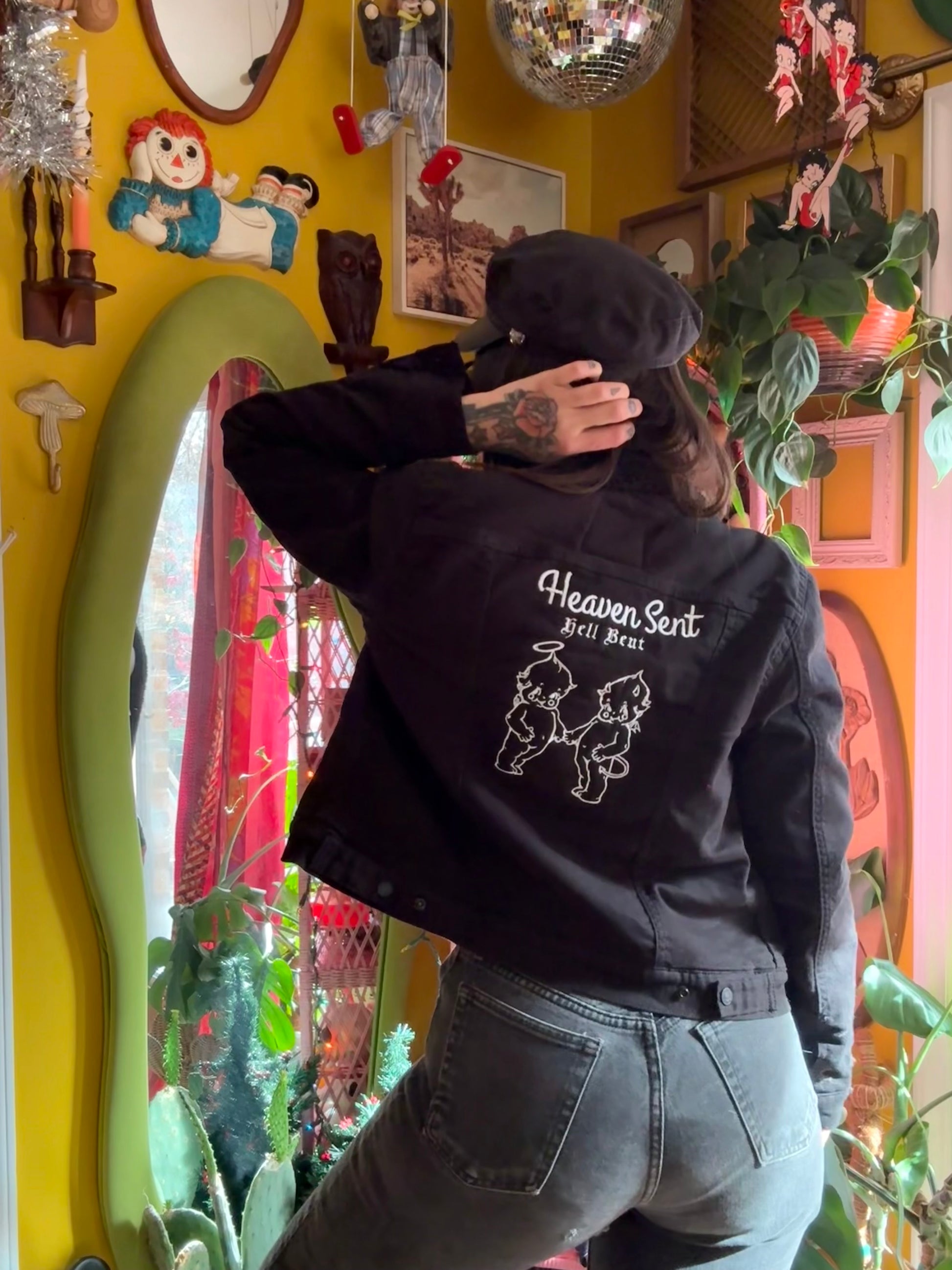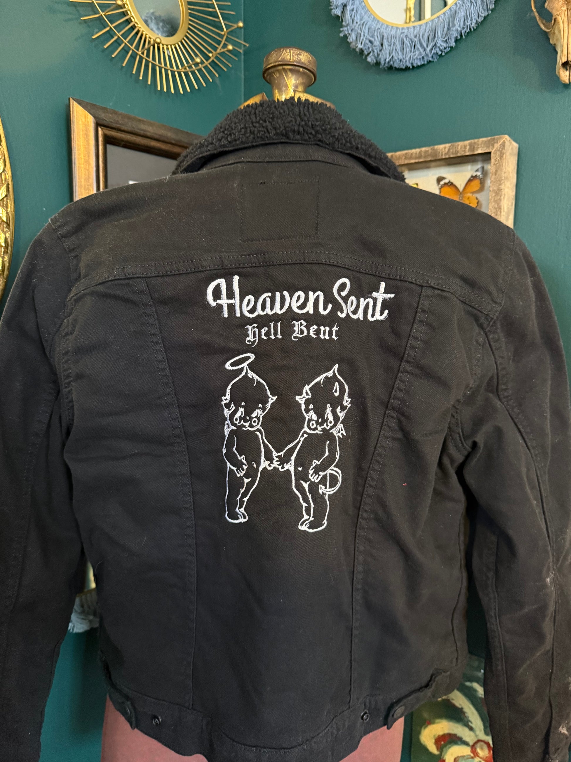 Statement Text: Embroidered phrase “Heaven Sent and Hell Bent” adds attitude and personality to the piece.