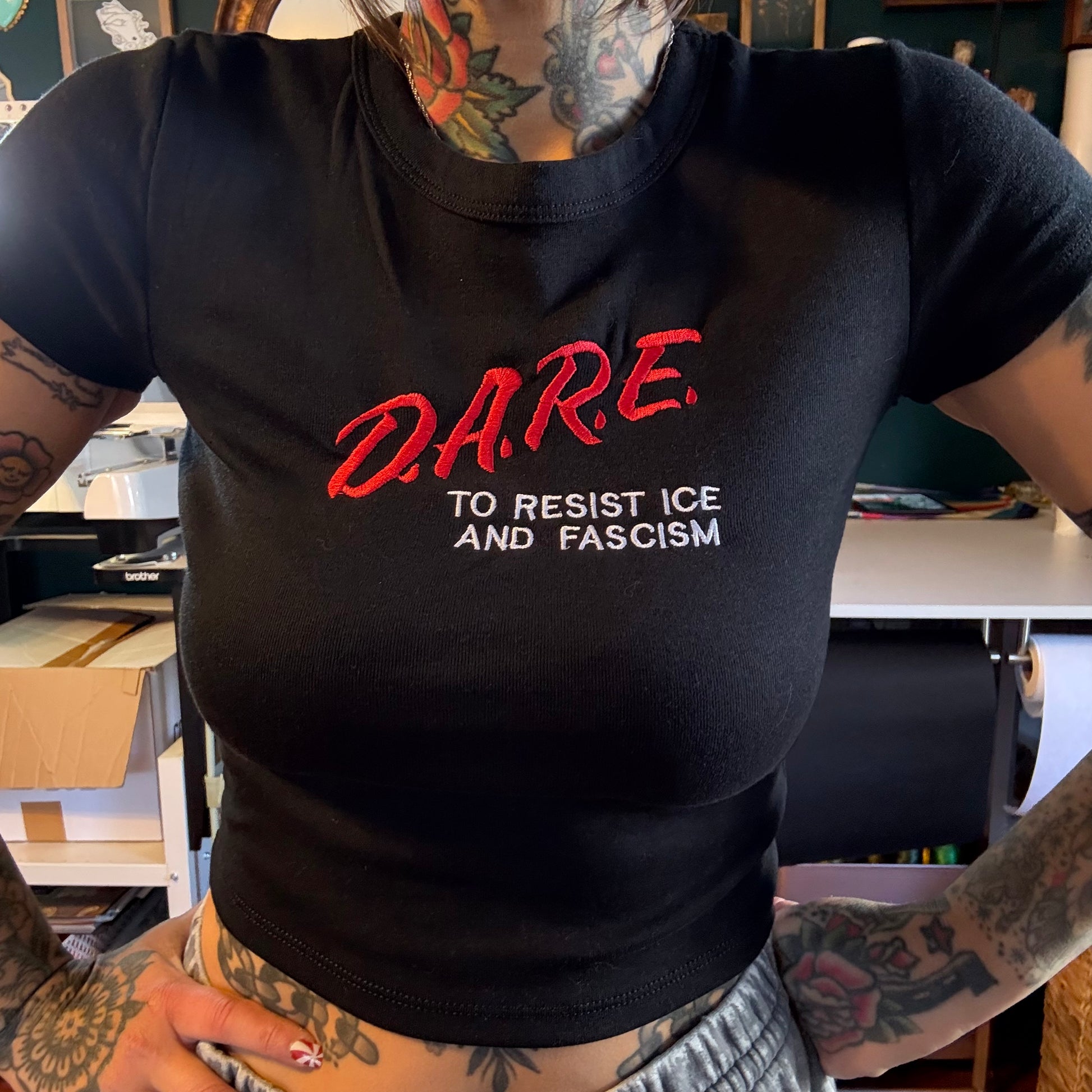 A bold political twist on a nostalgic classic, this DARE To Resist ICE and Fascism embroidered tee turns a familiar design into a statement of solidarity and resistance. Available as a relaxed unisex t‑shirt or a fitted baby tee, each piece is embroidered to order for crisp detail and long‑lasting wear.